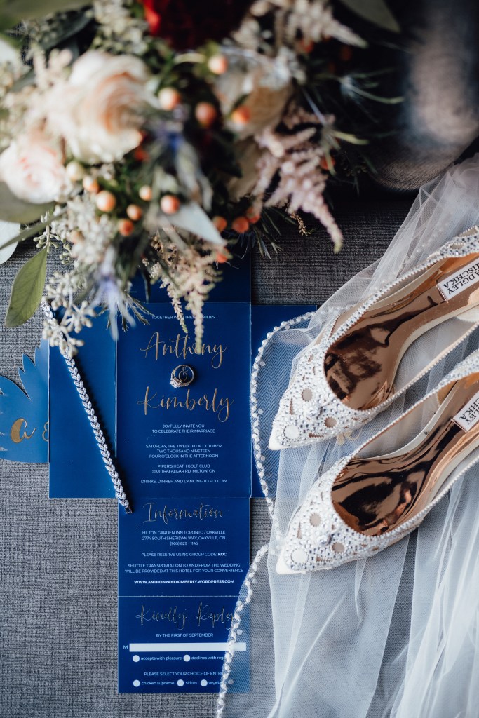 Formal wedding invite in navy blue and gold, designed to complement the theme of a fall wedding. Fine details included a gold foil finish, custom die-cut, and a modified iron cross fold. Other responsibilities included sourcing a printer and consulting with print professionals.